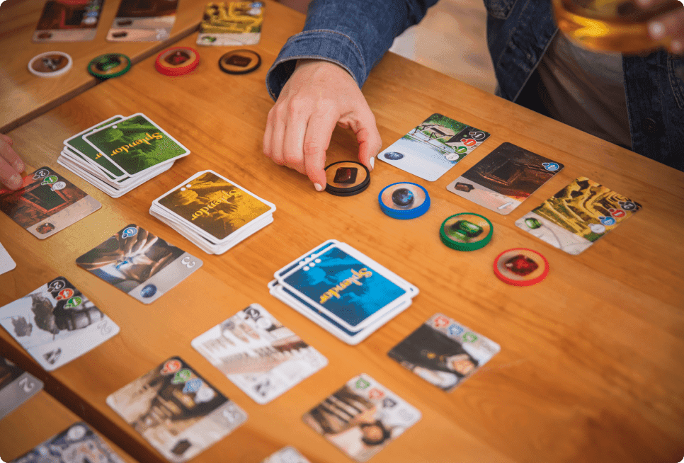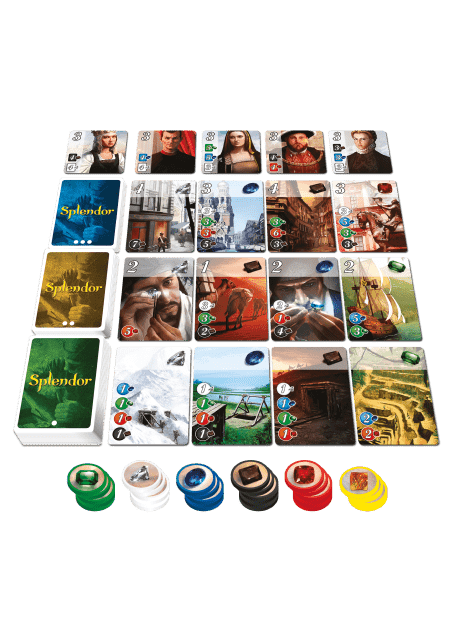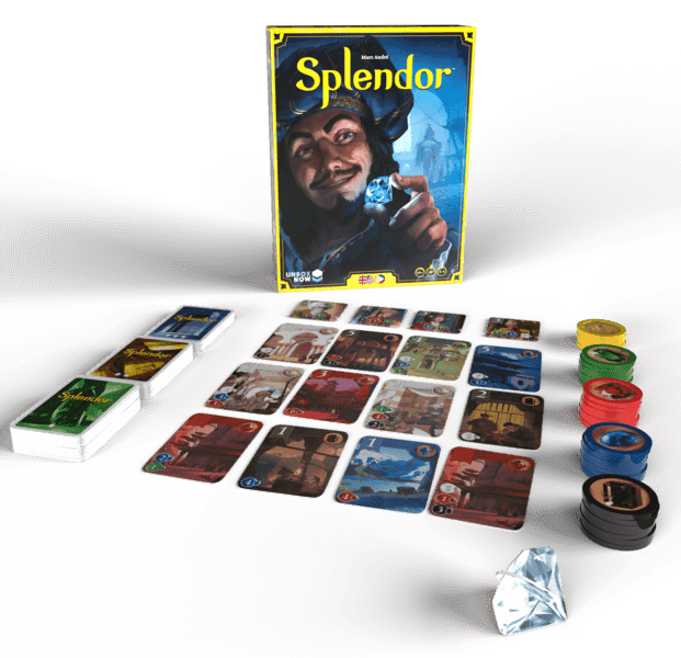 Componentele frumos ilustrate însoțesc modul de joc simplu și elegant al jocului Splendor.